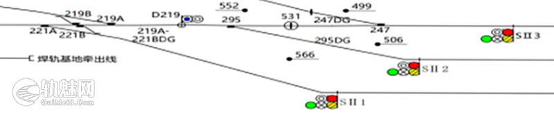 再例如:乌西站Ⅱ场2道、3道东端出发信号机前后钢轨,从图上可以看出,D219信号机处绝缘为侵限绝缘,那么施工计划编制的时候就不能将D219信号机作为封锁起点或是封锁终点,如果将D219信号机作为封锁起点或是封锁终点,施工封锁后219A-221A复交至1道因未封锁,可以办理接发列车,此时如果正好排列219A-221A复交至1道的进路,施工作业因更换钢轨设置连接线,247DG、295DG出现红光带,联锁就默认247DG、295DG轨道区段占用,就会造成219A-221A复交至1道的进路强行取消。