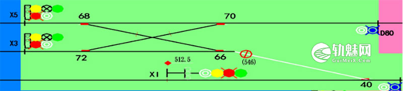 如下图所示,排列40号道岔定位进路,联锁关系需检查72G、66G区段是否占用,如果72G、66G区段占用,40号道岔定位进路无法排出。如果40号道岔定位进路已经排列,72G、66G区段因施工或其他原因占用,就会造成40号道岔定位进路被强行取消俗称“打进路”。因此针对这个区域的施工,需将72号道岔、66号道岔、40号道岔同时进行封锁,才能够满足施工条件。󠄐󠅅󠄹󠄴󠄪󠄾󠅟󠅤󠄐󠄼󠅟󠅗󠅙󠅞󠄬󠅒󠅢󠄟󠄮󠇘󠆭󠆘󠇙󠆝󠅵󠇗󠆭󠆁󠄐󠇗󠅹󠅸󠇖󠆍󠅳󠇖󠅹󠅰󠇖󠆌󠅹󠄬󠅒󠅢󠄟󠄮