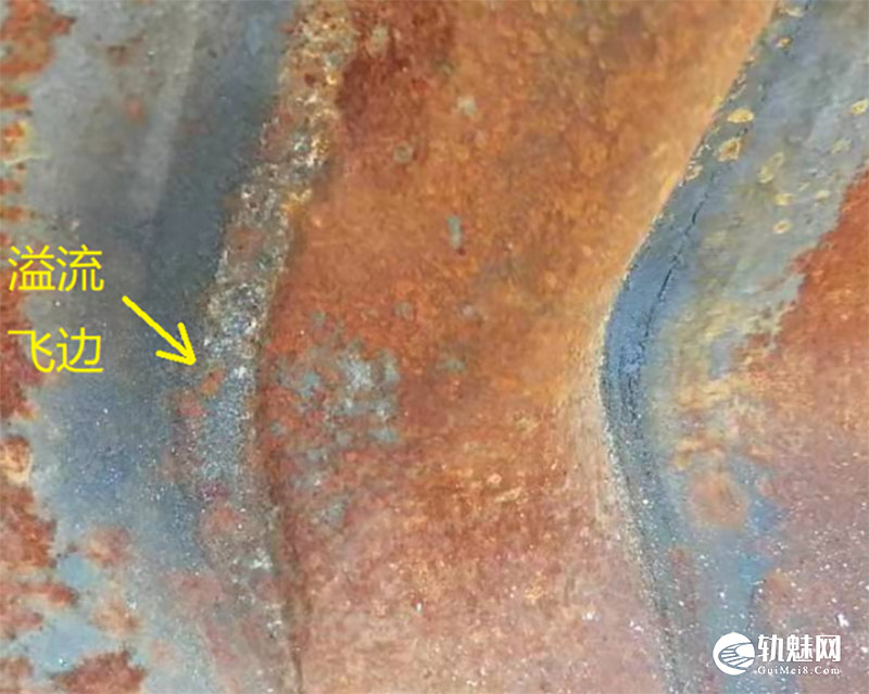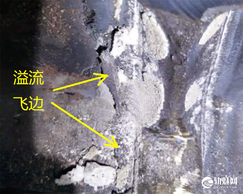 溢流飞边的产生一般是由于砂模和钢轨密贴不好,浇注时高温铁水进入砂模和钢轨间的缝隙而形成。因此砂模在安装过程中,尽量保证钢轨与砂模之间的密贴是避免出现溢流飞边的有效途径。