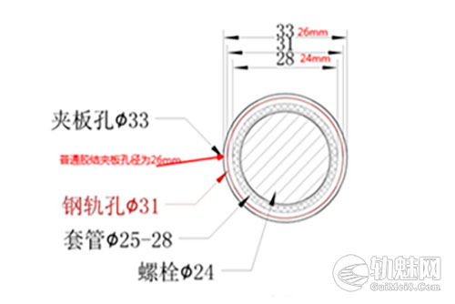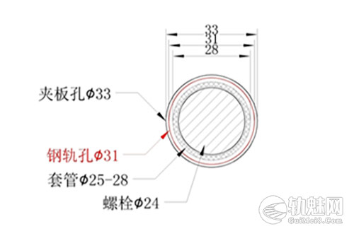 胶结绝缘夹板:夹板标准孔径φ33mm、钢轨标准孔径φ31mm、套管内外直径分别为φ25mm和φ28mm、螺栓外径φ24mm。