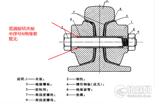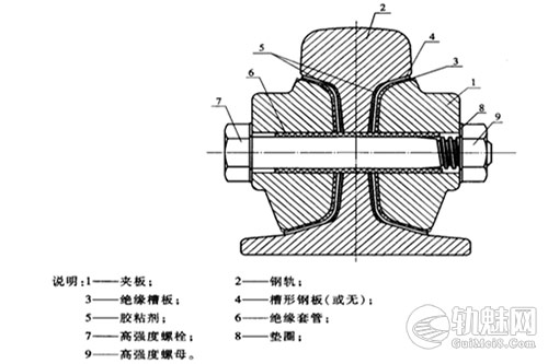 胶接绝缘夹板:复合结构,绝缘轨端、绝缘套管、、专用绝缘胶;螺栓孔带绝缘套管,两轨间加绝缘端板,阻断电流传导。